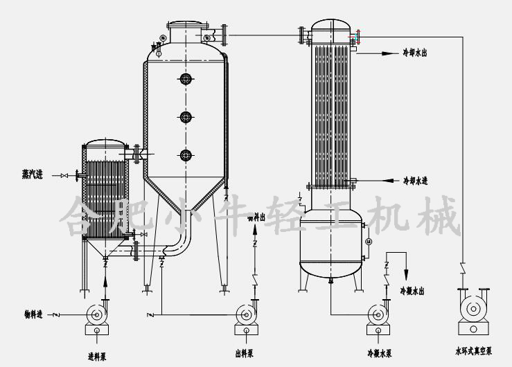 單效外循環(huán)蒸發(fā)器(單效濃縮器)在工作時(shí),濃度較低的稀料液由進(jìn)料泵或利用真空自吸的方法進(jìn)入加熱器的管程,鍋爐高溫蒸汽進(jìn)入加熱器的殼程,蒸汽對(duì)管程內(nèi)的料液間接性加熱,料液受熱后沸騰,液面上升,從噴射管噴入分離器,進(jìn)行閃蒸,在分離器內(nèi),比重較重的料液下降至底部,經(jīng)循環(huán)管回到加熱器再次受熱,受熱后再次沸騰噴入分離器,以此形成循環(huán),而比重較輕的二次蒸汽上升至頂部,經(jīng)二次蒸汽管路進(jìn)入列管式冷凝器殼程,被冷凝器管程內(nèi)的冷卻水冷凝成液相后進(jìn)入冷凝水收集罐,最后由泵排出,以便回收利用或另行處理,一部分不凝氣體由真空泵抽走排出,當(dāng)料液濃縮到一定的程度,經(jīng)取樣確定合格后即可出料,至此完成蒸發(fā)濃縮的過(guò)程。