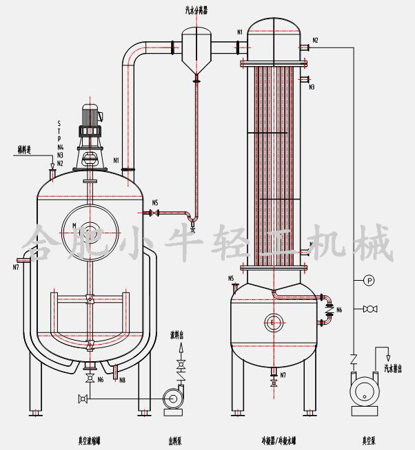 合肥小牛真空減壓濃縮器加熱形式可根據(jù)用戶工況設(shè)計(jì)為蒸汽加熱式或電加熱式,滿足無(wú)鍋爐熱源的用戶使用。真空濃縮罐設(shè)有夾套及保溫層,夾套內(nèi)通入蒸汽(蒸汽加熱式)或?qū)嵊停娂訜崾剑┻M(jìn)行加熱,從而給濃縮罐內(nèi)物料間接傳熱,耐高溫保溫層能有效隔熱保溫,減少能耗,有效避免操作人員燙傷事故發(fā)生。罐體配有視鏡視燈,能夠隨時(shí)觀察罐內(nèi)狀態(tài)。生產(chǎn)完成后,利用CIP自動(dòng)旋轉(zhuǎn)清洗球能夠?qū)迌?nèi)進(jìn)行360度沖洗。特殊定制的攪拌裝置有效地避免了料液因濃度過(guò)高而出現(xiàn)的粘壁現(xiàn)象,攪拌裝置采用優(yōu)質(zhì)機(jī)械密封,確保不會(huì)因高真空而出現(xiàn)漏氣現(xiàn)象。真空濃縮罐內(nèi)物料受熱而產(chǎn)生的蒸汽中帶有有效成份的泡沫在汽液分離器中被分離出來(lái)通過(guò)管道回流至罐內(nèi),其余二次蒸汽通過(guò)列管式換熱器被冷凝成液體,進(jìn)入冷凝水收集罐,最后排出或回收利用,不凝性氣體隨真空泵一起排出。該設(shè)備可進(jìn)行負(fù)壓或常壓操作,也可以進(jìn)行連續(xù)或間歇生產(chǎn)。